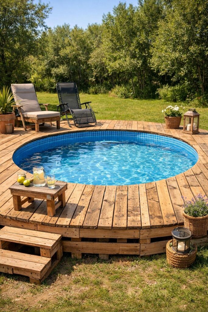 You can build a simple, low-cost deck from reclaimed pallet wood to give your above ground pool a sturdy entry and lounging area. Start by checking pallet condition and cleaning or sanding rough boards for safety.