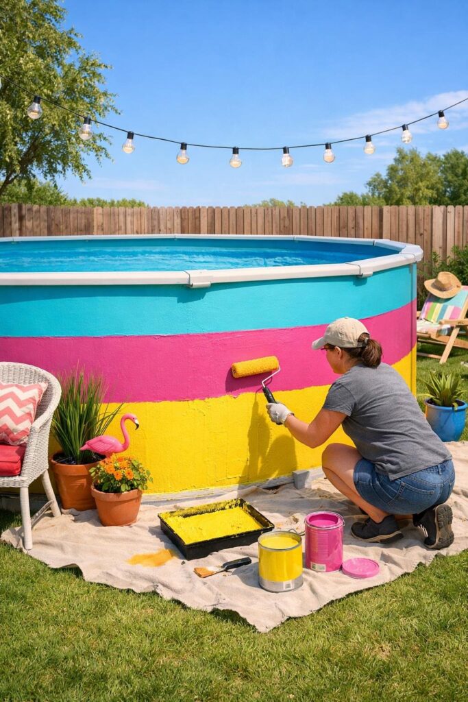 You can refresh your pool for little money by painting the outside in a fresh color. Pick a water- and UV-resistant exterior paint made for outdoor use.