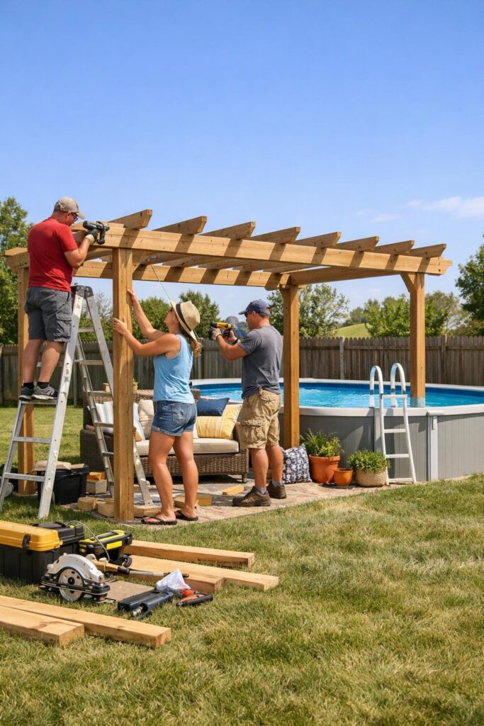 A simple pergola gives your above ground pool shade and a defined hangout spot. You can build one from pressure-treated lumber or reclaimed wood on a small budget.