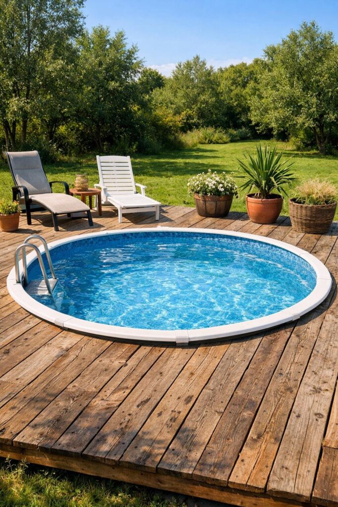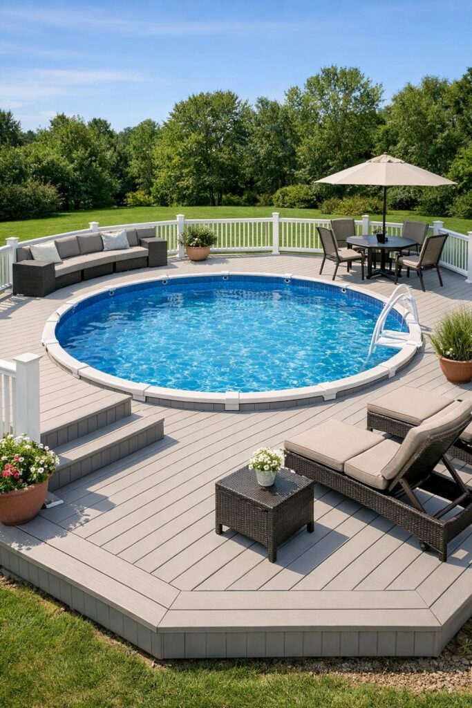 A vinyl wraparound deck fits snugly around your pool and looks neat without heavy upkeep. You can use budget vinyl boards that resist rot and need little sealing.