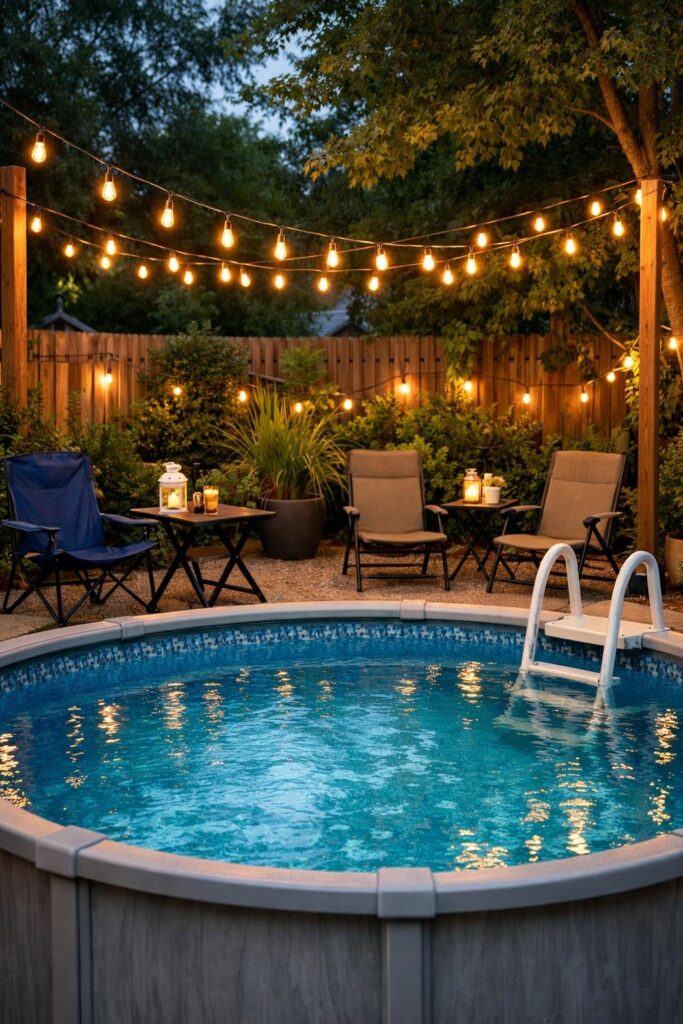 You can hang affordable string lights around your above-ground pool to add soft, warm light for evening swims.