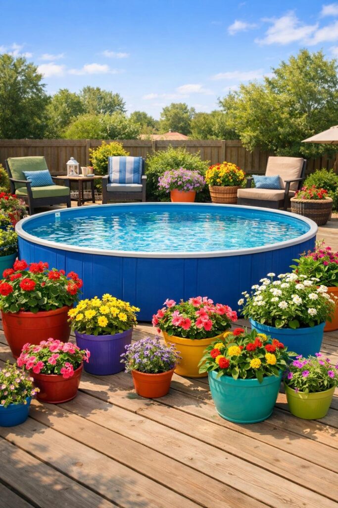 You can brighten your pool area with colorful potted plants that stay budget-friendly. Place them around the pool edge or near seating to create a cheery, tropical vibe.