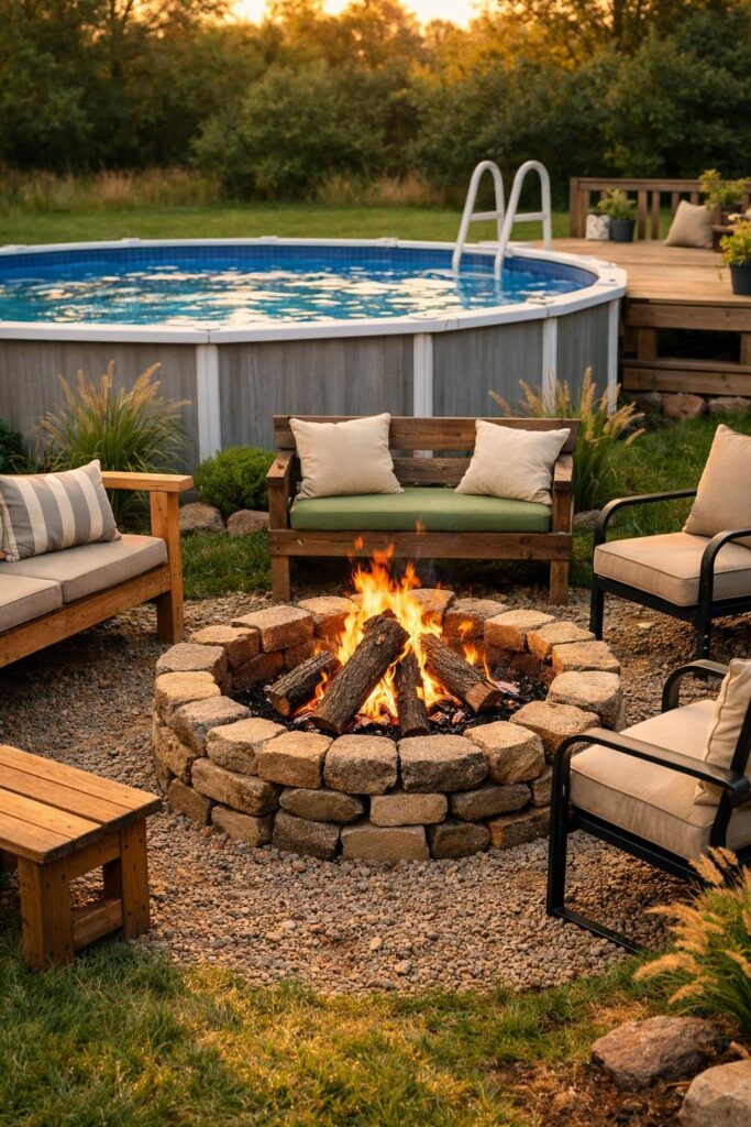 Add gravel and a few chairs for a cozy spot to roast marshmallows or relax after swimming. Check local rules and keep a bucket of water nearby for safety.