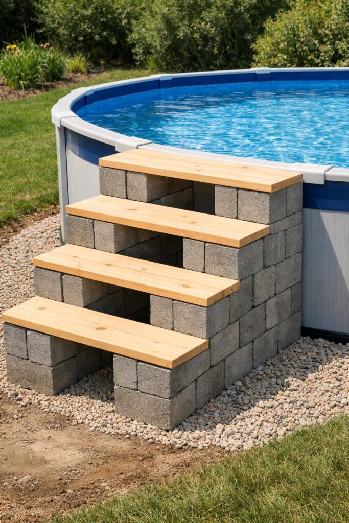 19. DIY pool steps with cinder blocks and wood