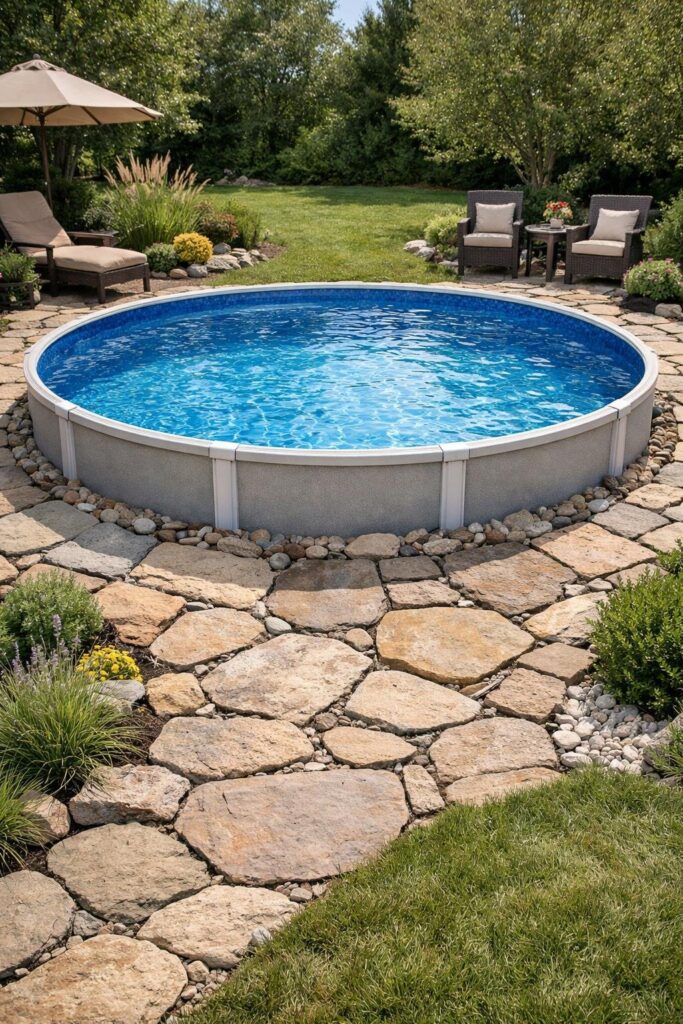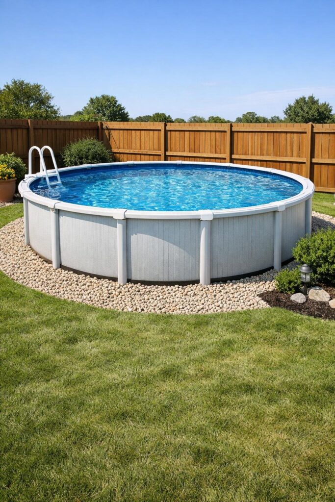 Gravel is affordable and quick to install, and it reduces mud and erosion around the pool. It also looks neat and pairs well with plants or a simple border.