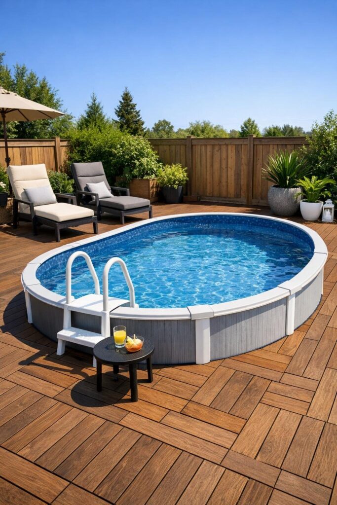 You can lay faux wood deck tiles around your above-ground pool for a warm, finished look without high cost. Tiles snap together and float on a leveled base, so installation is fast and mostly tool-free.