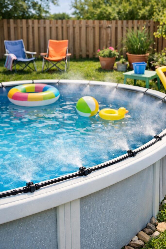 You can add a simple misting line around your pool to lower air temperature a few degrees on hot days. Buy a basic kit or use small nozzles, plastic tubing, and a hose adapter for an easy DIY job.