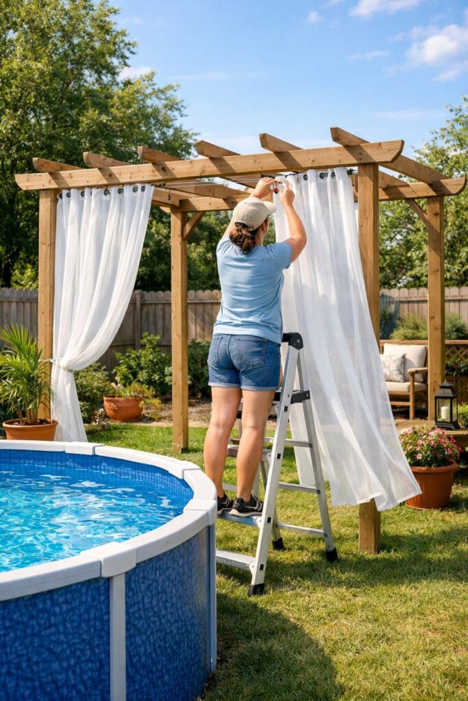 Use tension rods, curtain wire kits, or sturdy twine to hang curtains around your pool deck. Anchor to posts or the pool frame for a neat, removable setup.