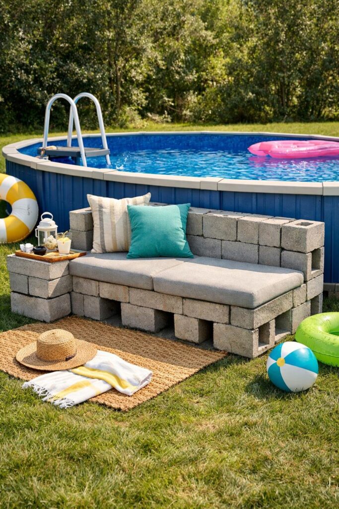 You can stack concrete blocks to make sturdy, low-cost benches around your pool. Add wooden planks or cushions on top for comfort.