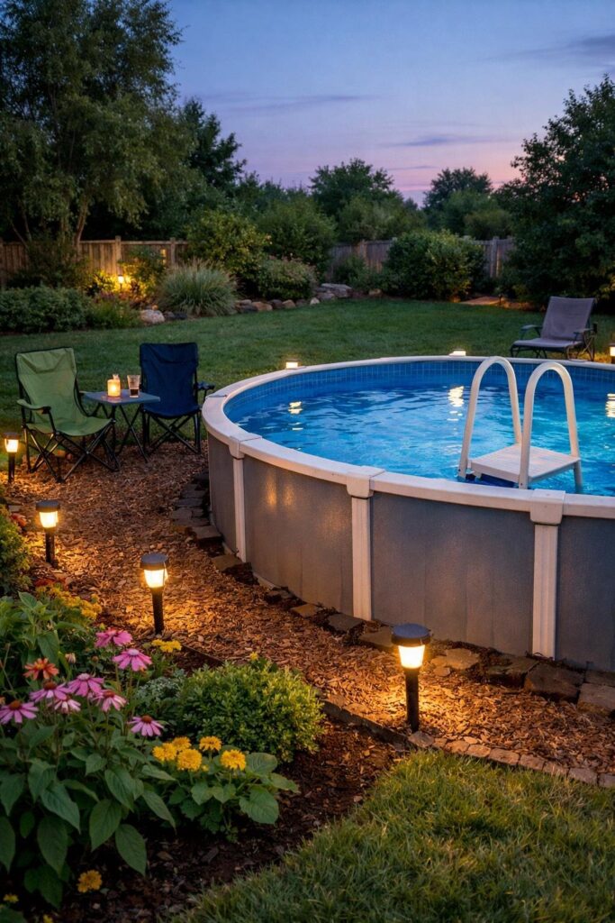 You can line the pool area with cheap solar lights to add soft, safe lighting without wiring. They charge by day and turn on automatically at dusk, so you save energy and effort.