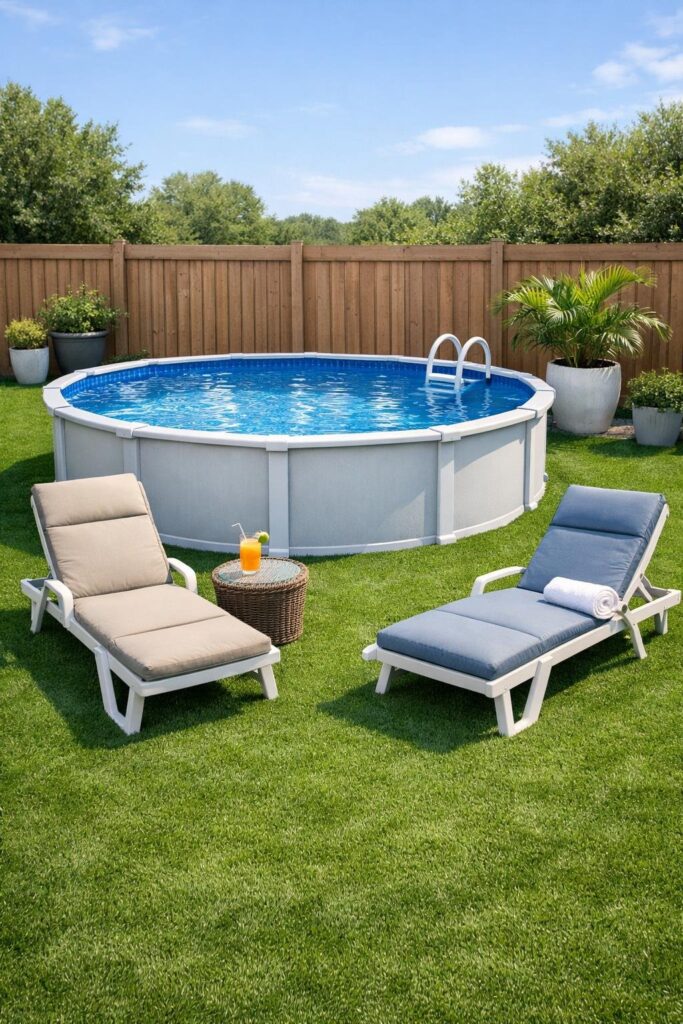 Choose cushions made for sun and water so they resist fading and dry quickly. They make seating cozier and hide basic pool frames without costing much.