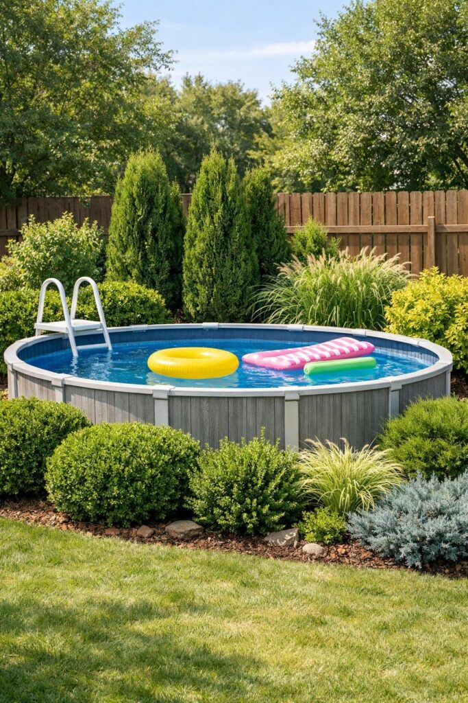 Choose shrubs that need little care and stay tidy near the pool. Evergreens like boxwood or laurel give year-round screening without constant pruning.
