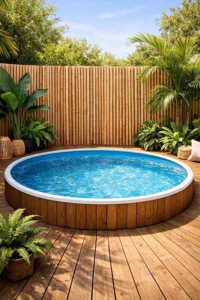 Bamboo fencing gives your pool a relaxed, tropical look without a big cost. You can buy panels or make a simple screen to fit your pool shape.