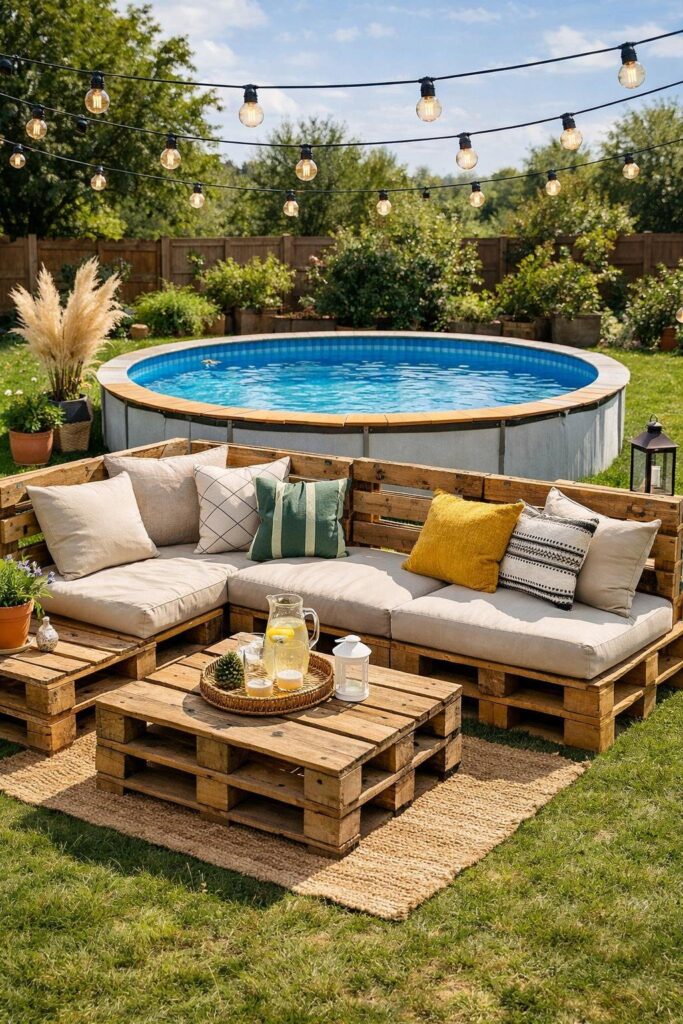 You can turn free or cheap pallets into sturdy poolside benches and loungers. Sand, seal, and stack pallets for height, then add cushions for comfort.