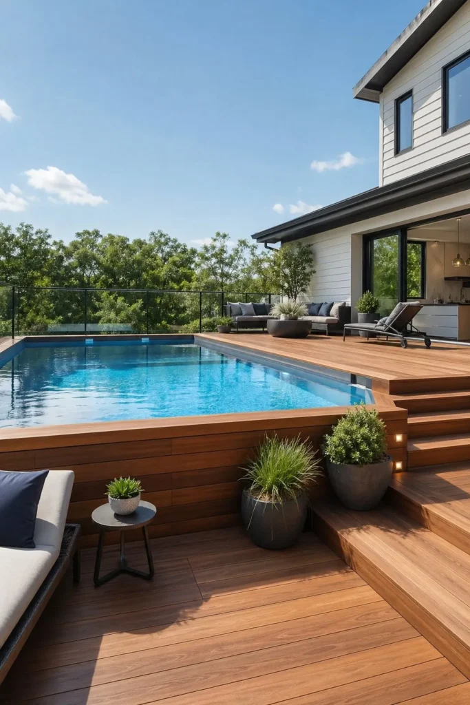 Add wide steps, simple railings, and a seating zone to make the transition feel smooth. This kind of aboveground pool deck also makes entertaining much easier.