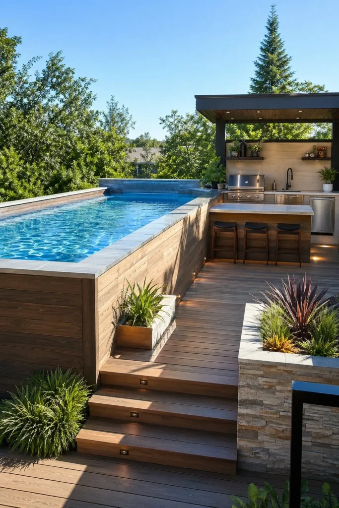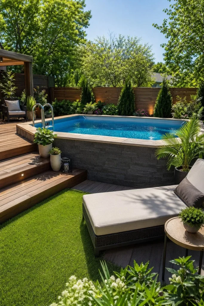 A raised pool can still look high-end in a compact yard when every detail feels planned. Use built-in seating, slim furniture, and a narrow deck to maximize space without crowding it.