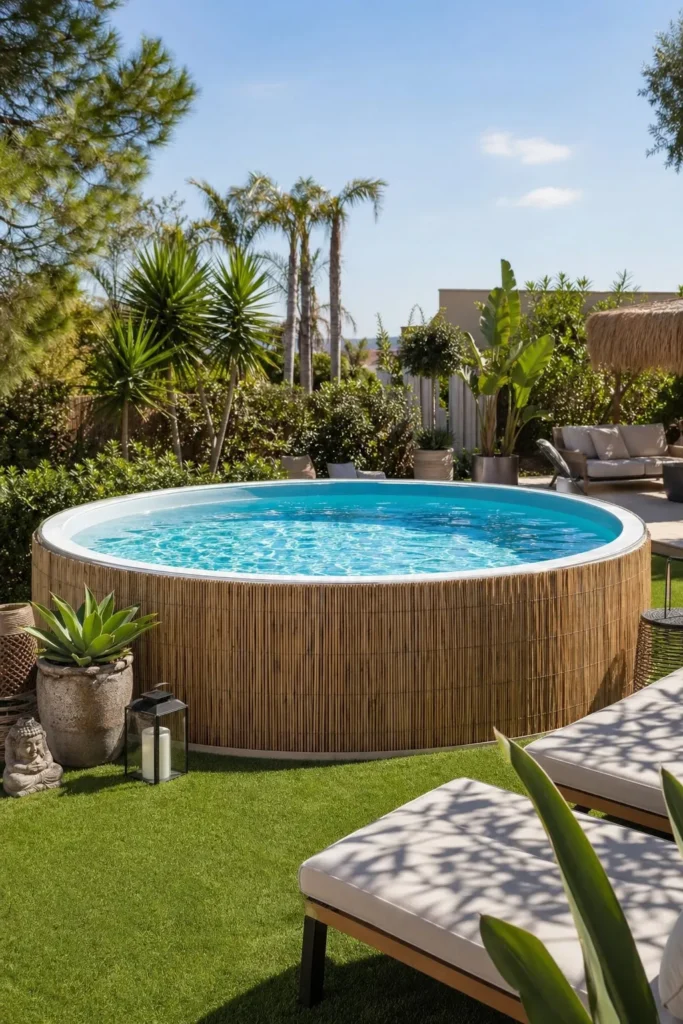 Reed fencing is a quick way to cover exposed pool walls and add texture. It gives the setup a relaxed, cabana-style look that works well with tropical or coastal decor.