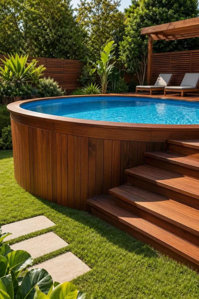 Custom wood paneling can completely change how an above-ground pool looks. Horizontal slats are especially effective because they feel modern and hide standard pool walls.