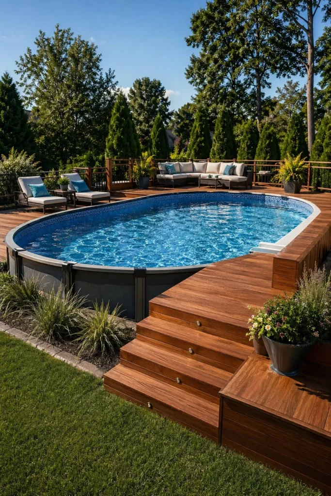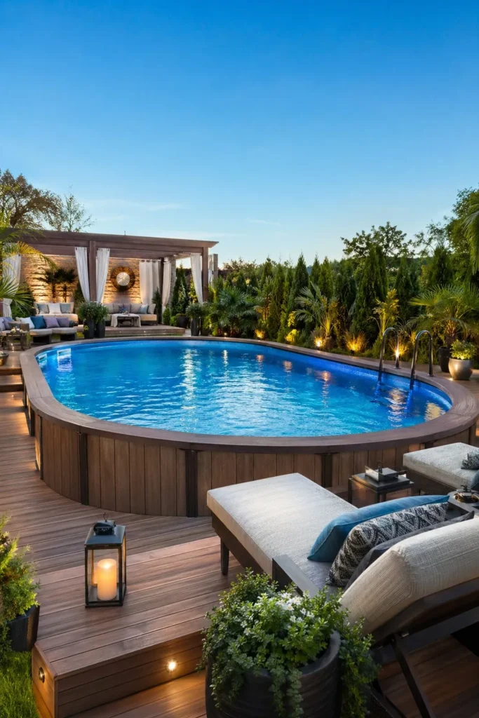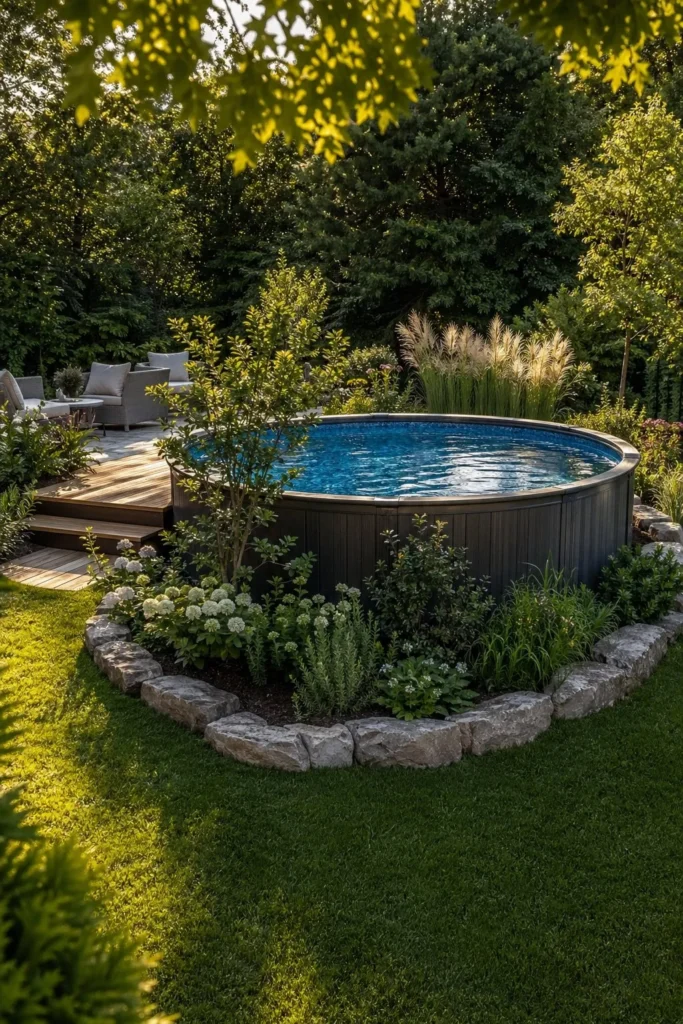 This style works well if you want above ground pool landscaping backyard ideas that feel lush and private. It turns the pool into part of the garden.
