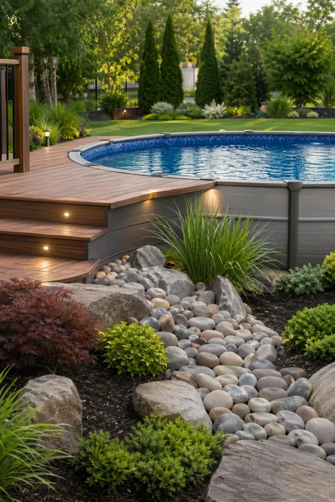 3. Chic Above Ground Pool Landscaping with River Rock
