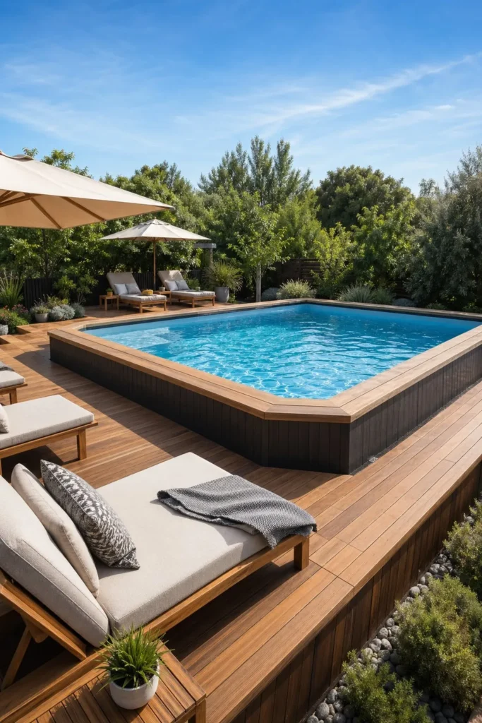 An elevated deck creates a true pool terrace effect. When you add sun loungers, umbrellas, and side tables, the whole area starts to feel like a private club.