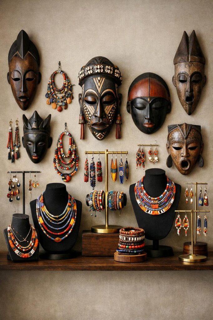 - 14. Mount masks alongside African beaded jewelry displays