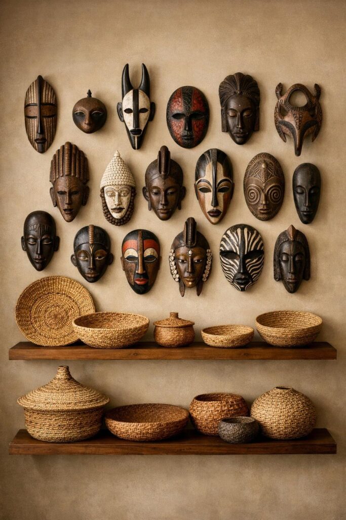 You can mix carved masks and woven baskets on one wall for texture and balance. Place masks as focal points and fill gaps with baskets in different sizes and weaves.