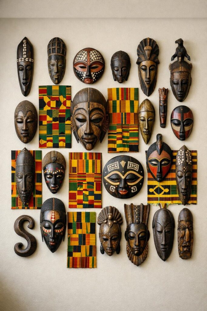 Try a large cloth behind a mask for a layered look, or frame small Kente pieces between masks. Keep colors balanced so your gallery feels lively but not chaotic.