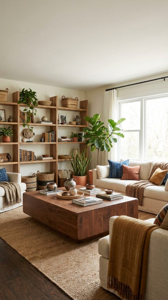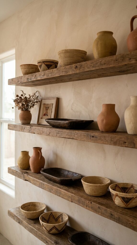 Add open wooden shelves to show off pieces you love. You can mix woven baskets, carved bowls, and pottery to add texture and story.