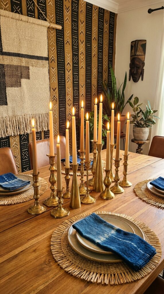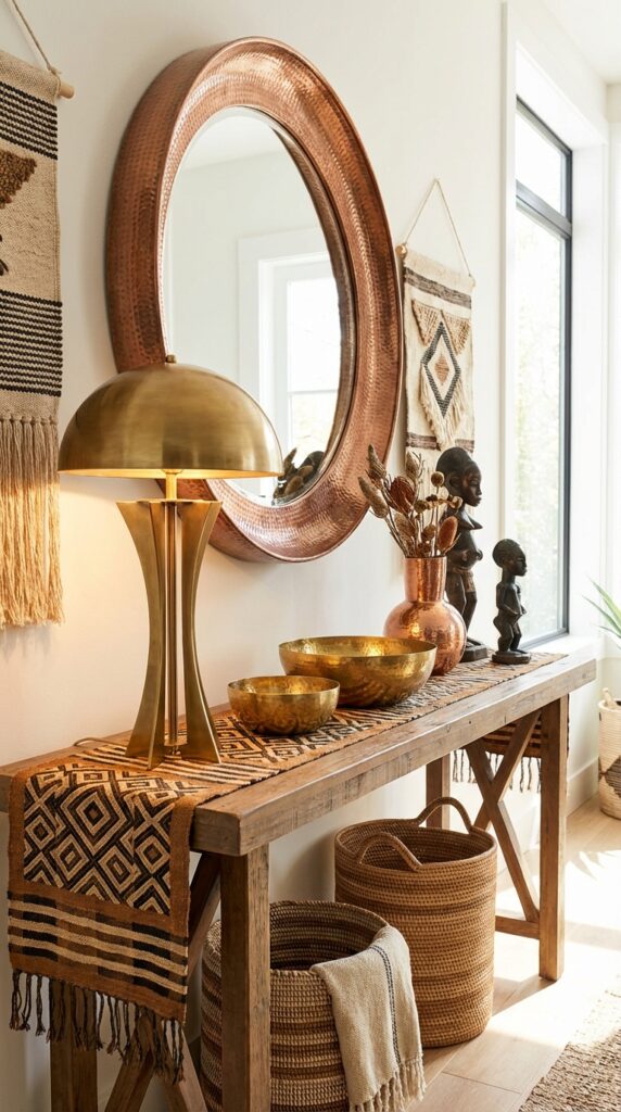 Add brass or copper pieces to warm up your space and echo traditional African hues. A lamp, mirror frame, or small sculpture can catch light and draw the eye.