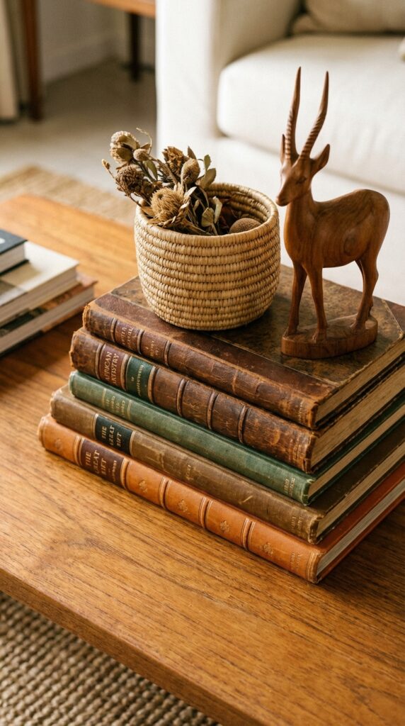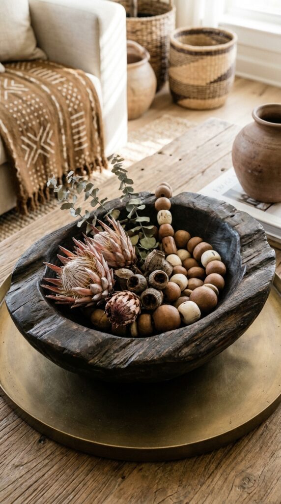 Choose a hand-carved wooden bowl or sculpture as your coffee table focal point. Its texture and warmth add instant character without cluttering the space.