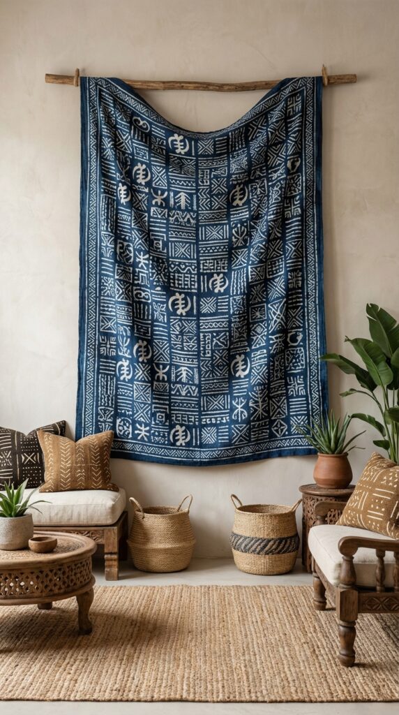 You can add color and pattern quickly with a batik wall hanging. Choose bold or muted designs to match your room’s mood.