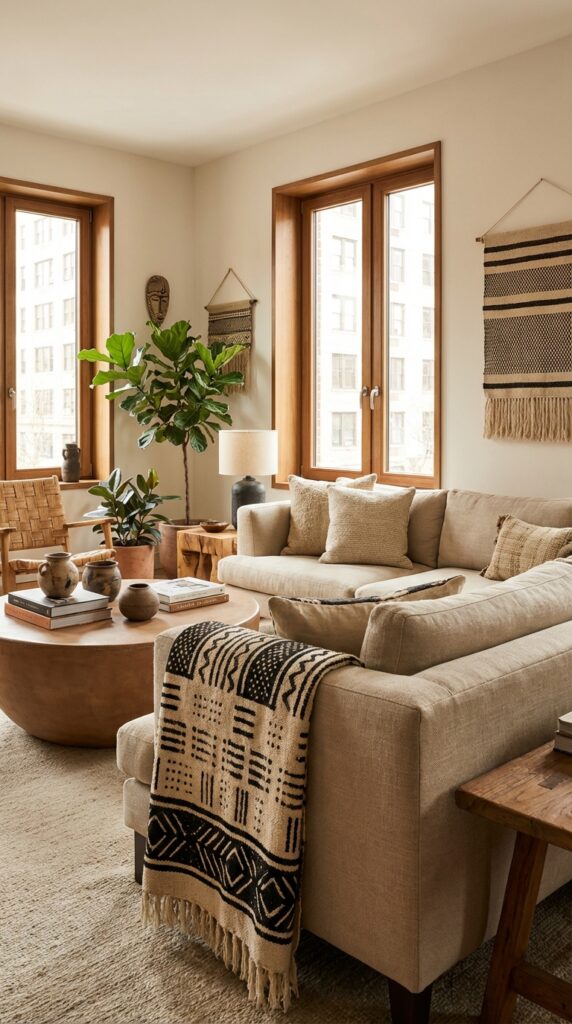 Pair wood furniture with soft textiles and plants to soften lines and add life. This creates a calm, lived-in look that fits Afro-chic style.