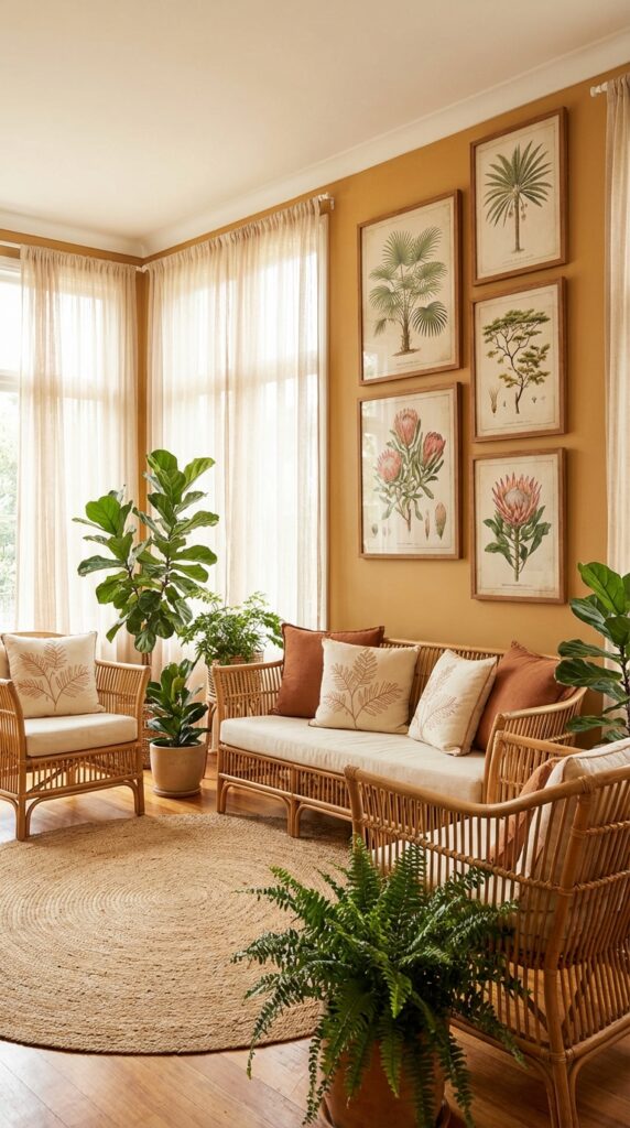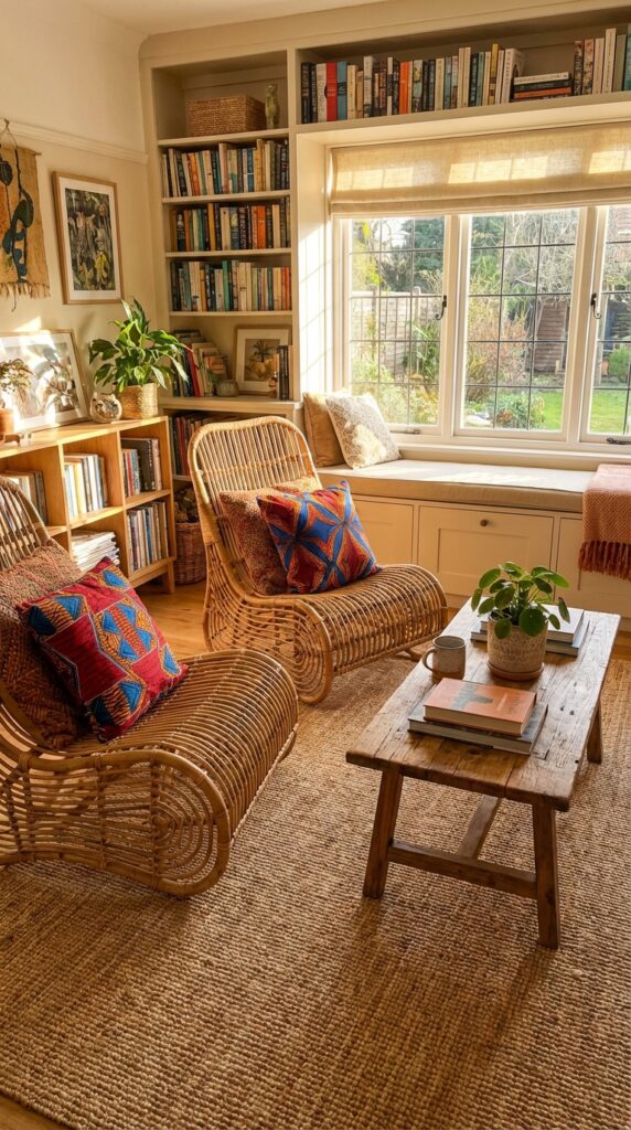 Add woven rattan chairs to bring natural texture and warmth to your room. They work well with bold prints and earthy tones common in Afro-chic style.