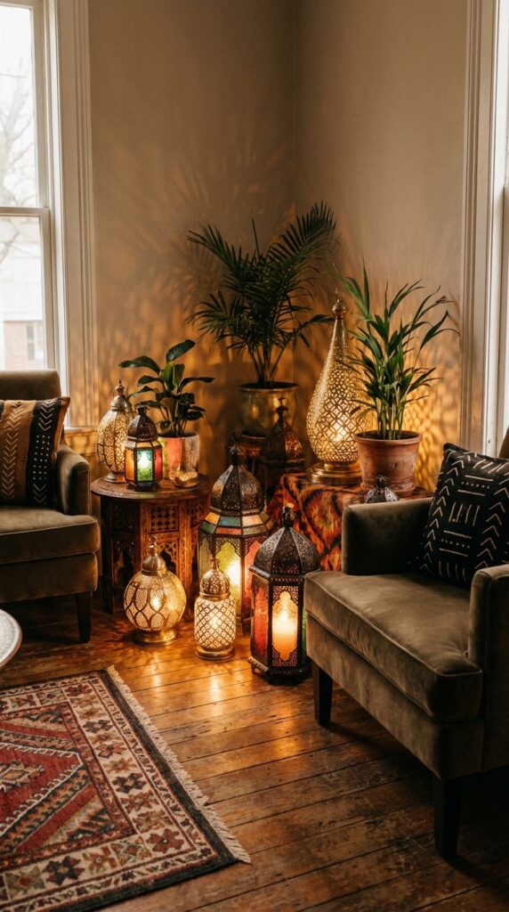 Place Moroccan-style lanterns to warm your room with soft, patterned light. You can hang them, set them on a table, or cluster a few on the floor for a cozy vibe.
