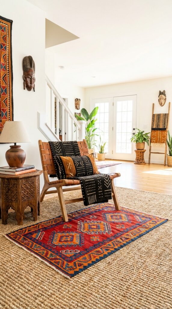 Choose natural fibers like jute, seagrass, or cotton for texture and durability. Pick a neutral tone or a simple pattern to blend with Afro-chic textiles and wood furniture.