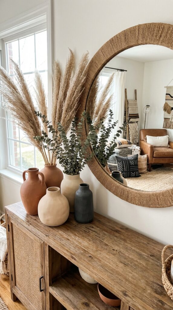 Fill them with dried grasses like pampas, bunny tails, or eucalyptus for low‑maintenance style. Group different heights on a table, shelf, or floor to create a simple, balanced look.