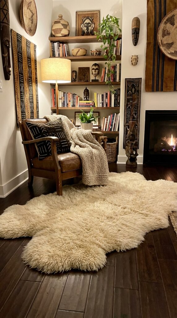 Place a shaggy sheepskin rug to add cozy texture to your room. It softens hard floors and makes seating areas feel inviting.
