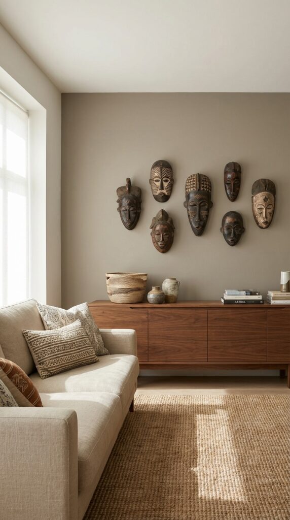 Pick pieces that reflect cultures respectfully and match your room’s tones. Mount securely and at eye level so your masks feel intentional and bold.