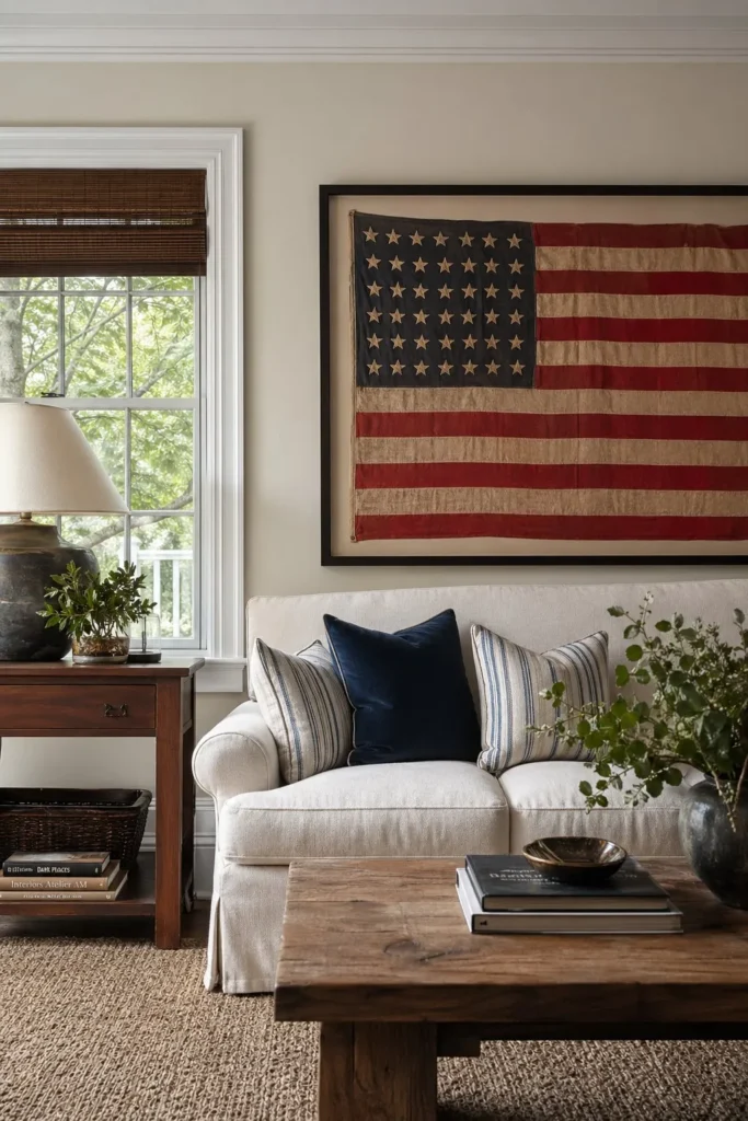 A beautifully weathered flag placed in a simple wood frame creates an instant focal point for your space. It is a fantastic way to incorporate vintage americana decor without feeling like a temporary holiday display. Anchor the seating area around this statement piece by keeping your sofa neutral and layering in striped throw pillows.