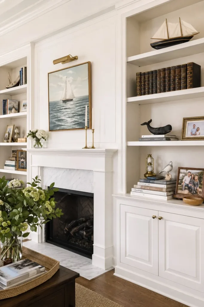 Custom or modular bookshelves flanking a fireplace are a hallmark of a new england style living room. Fill the shelves with a curated mix of hardcover books, brass objects, and framed family silhouettes. This creates a refined, intellectual atmosphere that still feels completely comfortable and lived-in.