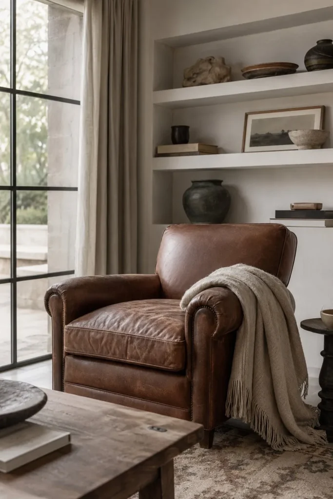 Contrast is essential when putting together a room that feels historically rooted but currently relevant. The rugged texture of a distressed brown leather armchair balances beautifully against a soft, breathable linen throw. This combination invites people to sit down and relax while adding layers of tactile interest to your space.