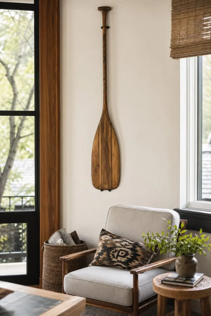 Bring the charm of a summer getaway into your everyday living space by curating a rustic corner. Mount a vintage wooden canoe paddle or an old fishing creel on the wall above a comfortable reading chair. These outdoorsy elements introduce a relaxed, vacation-like energy to your home.