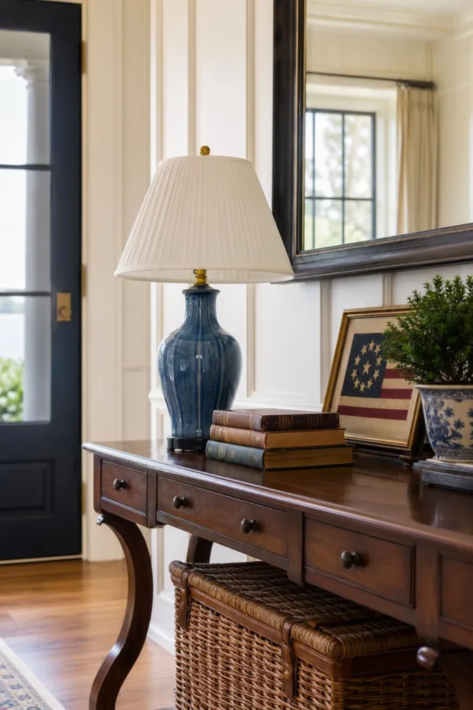 Your living room often overlaps with the front entry, making it the perfect place to set the tone for your home. Style a narrow console table with a blue ceramic lamp, a stack of old books, and a small framed flag. It establishes your design theme right at the front door and offers a practical spot to drop your keys.