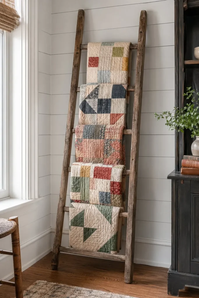 3. Display Heirloom Quilts on a Wooden Blanket Ladder