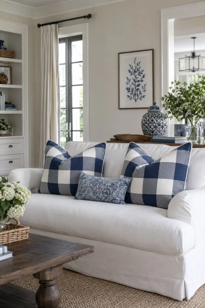 Buffalo check is a foolproof pattern for pulling off that classic, comfortable country aesthetic. Toss a few navy blue buffalo check pillows onto a crisp white slipcovered couch for instant visual contrast. This easy update brings a fresh, coastal-inspired twist to your standard seating arrangement.