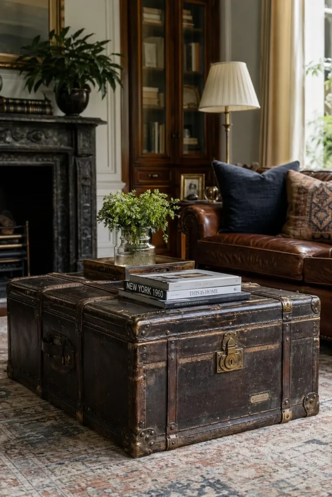 Replace a standard coffee table with an old wooden or leather steamer trunk to add authentic character to your space. A traditional collected living room thrives on pieces that look like they have a story to tell. Trunks also offer brilliant hidden storage for extra blankets, board games, or seasonal decor.