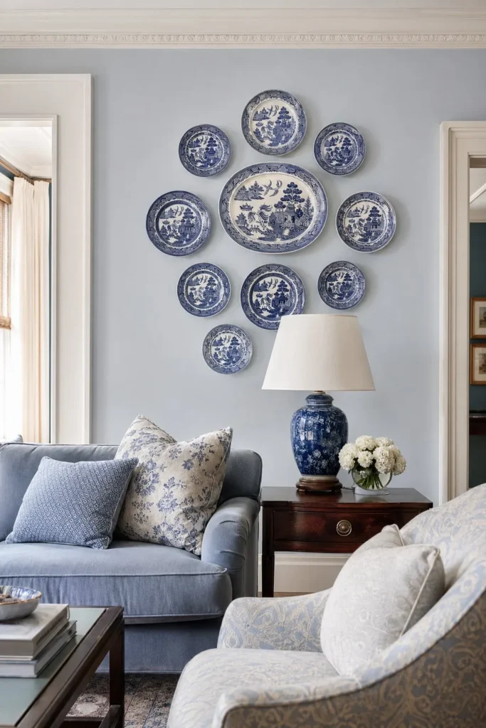 Arranging vintage china on the wall is an old-school trick that feels fresh again today. A blue willow decor living room uses the crisp blue and white patterns of these classic plates to create striking visual art. Group them tightly together above a console table or flanking a mirror to make the biggest impact.