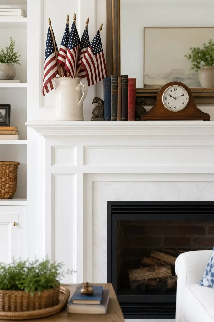 Your mantel is the perfect spot for rotating small, seasonal touches throughout the year. Arrange farmhouse patriotic decor by placing small stick flags inside a chipped ironstone pitcher alongside vintage hardback books. This setup feels understated, charming, and incredibly easy to swap out when the seasons change.