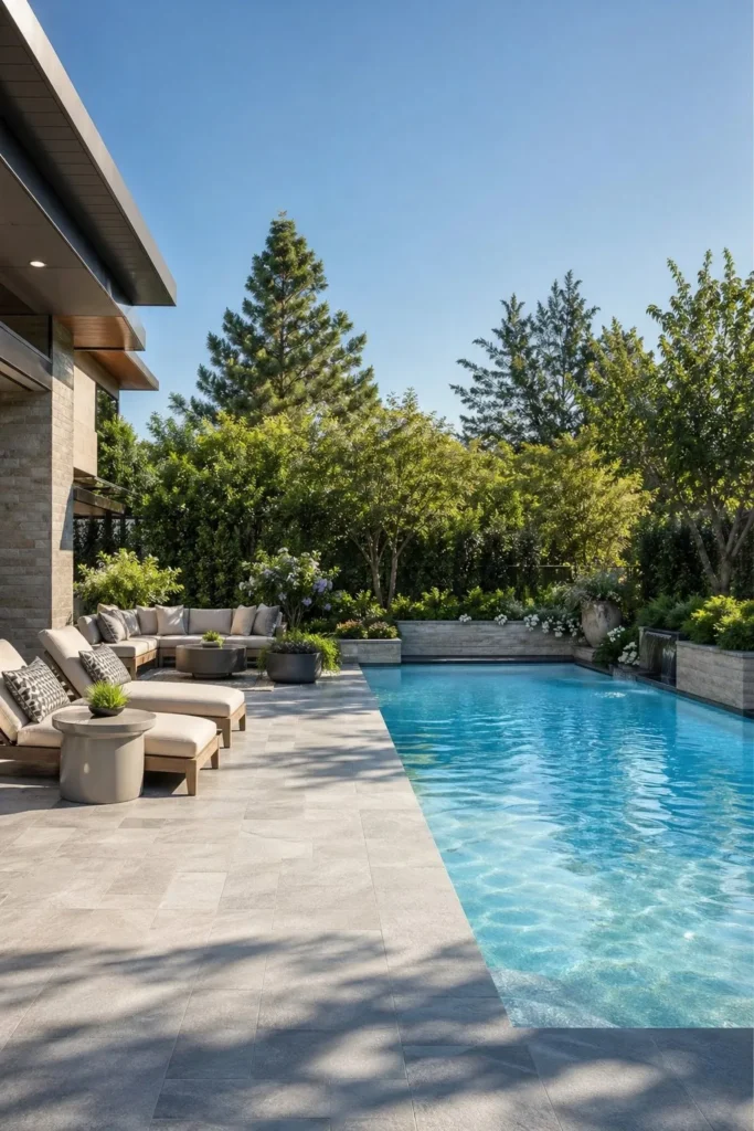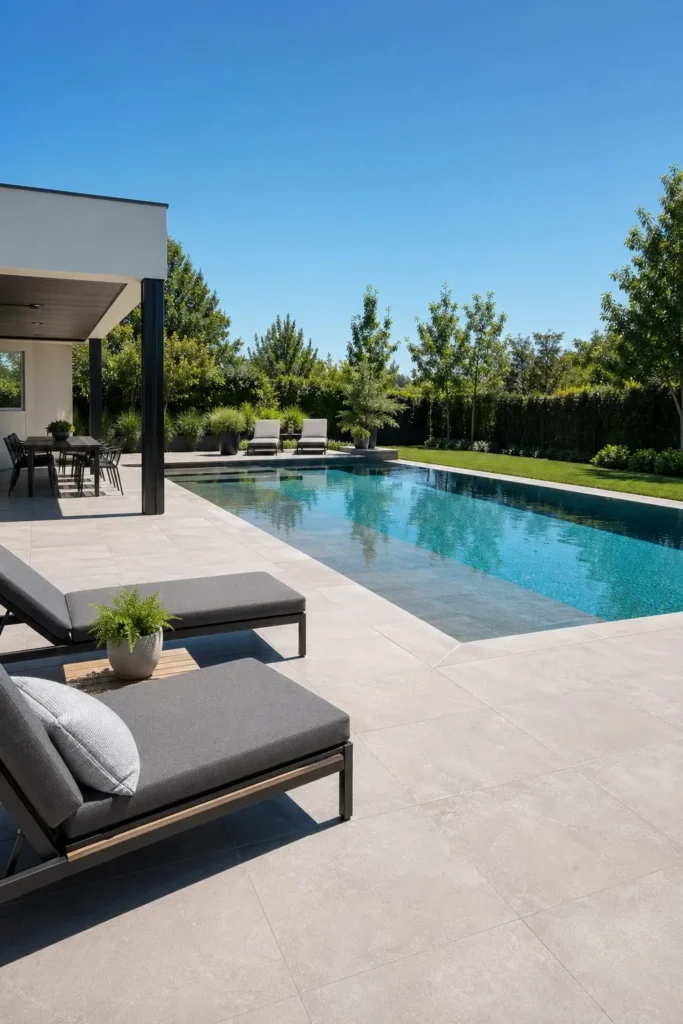 Large ground tiles make the deck look wider and less busy. Keep grout lines tight and continue the same tile through nearby patios for strong visual flow. For contemporary backyard patio designs with pool, this detail makes a big difference in how polished the space feels.